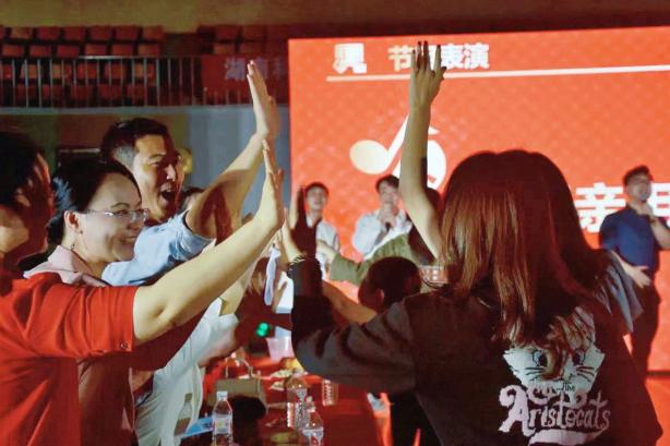 晚上,庆“五一”茶话会在北校篮球馆举行。由学生工作处处长蒋利平和各学院党委副书记组成的“学工天团”带来了节目舞台走秀《super star》,辅导员老师们带来合唱《上春山》、器乐《少女的祈祷》、舞蹈串烧《你要跳舞吗》、情景剧《辅导员的一天》、器乐合奏《青花瓷》、朗诵《科大颂》、脱口秀、歌曲串烧《歌唱联盟》等节目,晚会中还穿插了趣味小游戏和抽奖环节,现场掌声和欢笑声不断。