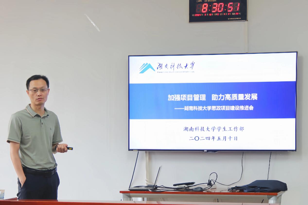 5月10日上午,湖南科技大学思政项目建设推进会在立德楼211会议室召开。校党委委员、纪委书记郭时印出席会议,社科处、人事处、学工处、财务处等部门负责人以及各思政项目负责人参加会议。