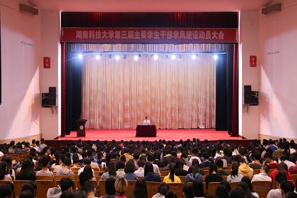 2016年5月7日14:30,我校主要学生干部参加了在南校区俱乐部举行的湖南科技大学第三届主要学生干部学风建设动员大会。此次大会由学生工作处李红革处长和校团委尹风雨书记主讲。学生工作处副处长蒋利平,学生管理科科长姜太军出席了此次大会,同时,部分学院的辅导员也到场聆听这场大会。此次大会由学生工作处和校团委联合主办,校学生自理会和校团委学生会联合承办。校学生自理会李昊阳主席主持此次大会。