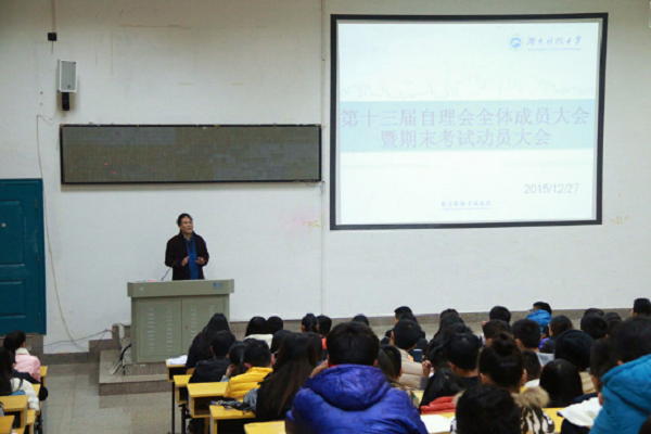 12月27日19:30,由学生工作处主办的第十三届校学生自理会全体成员大会暨期末考试动员大会在美术楼104教室举行。莅临本次大会的有学生工作处处长李红革及管理科科长姜太军。会议由姜科长主持进行。