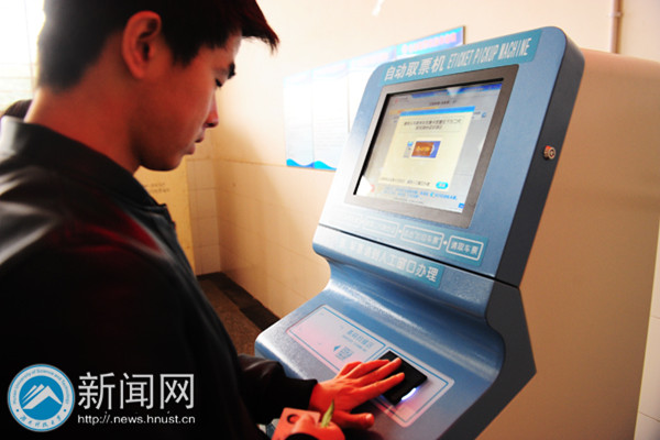 1月5日,湘潭高校首台自动火车票取票机在我校第九教学楼正式上线运行,学生们凭身份证、学生证,按照页面提示,轻点触摸屏,足不出校,就能轻松取到火车票、高铁票。