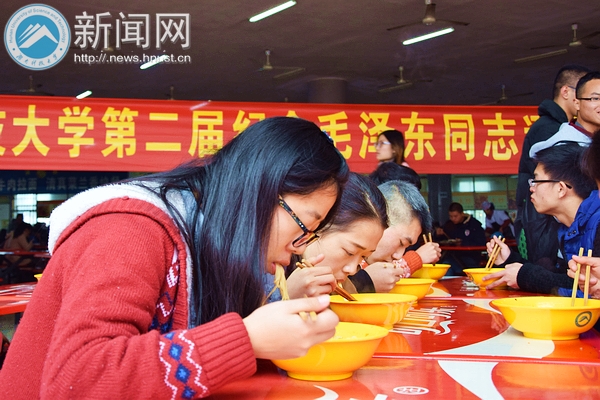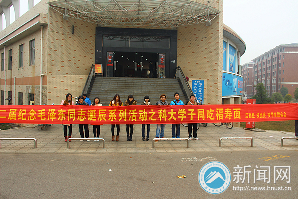 12 月26 日 中午,由校团委主办的“科大学子同吃福寿面”活动在八区新食堂举行。活动当天,我校贫困学生可以拿着印有毛泽东头像的特制“粮票”,排队免费领“福寿面”。