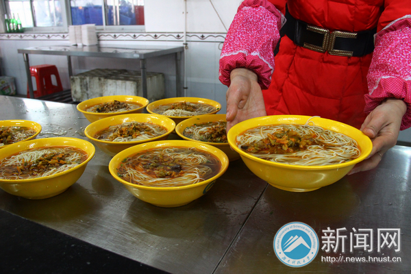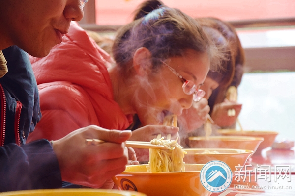 上午10点左右,食堂工作人员就已经开始擀制面条,并进行卫生的清理。12点,学生们排着队,欢声笑语驱赶了窗外的寒风。“在这风雨交加的冬天,吃上这热腾腾的面条感觉好温暖。”商学院市场营销专业的邹芷康说。