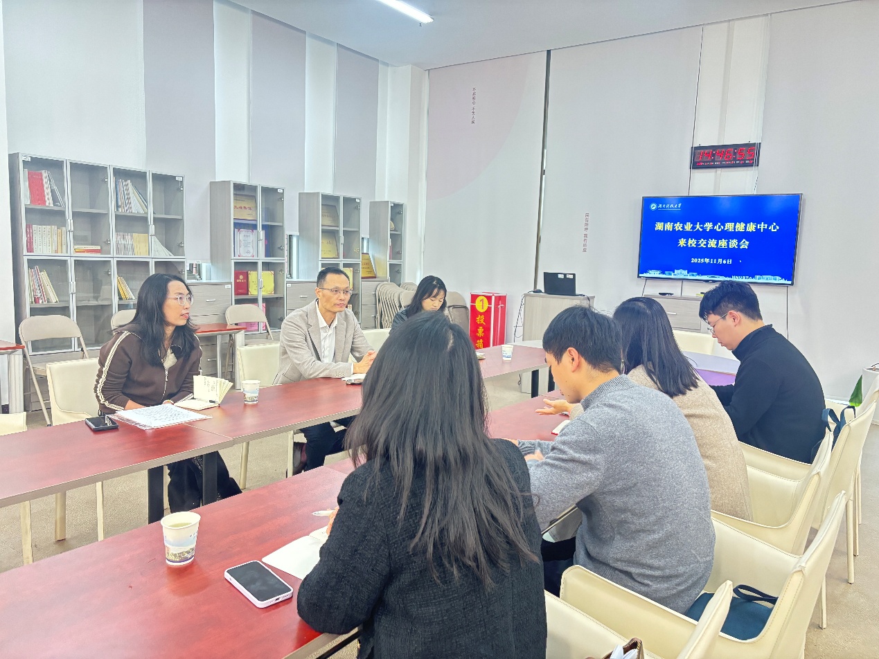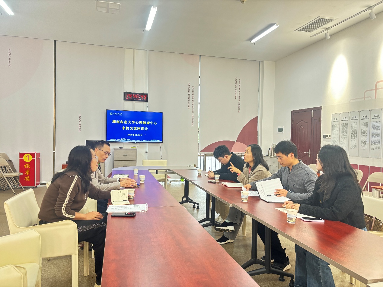 11月6日下午,湖南农业大学学生工作部副部长朱佳、心理健康教育中心主任李光程及专职教师黄伟、葛俊艳一行莅临我校,于立德楼101室,就大学生心理健康教育必修课教学大赛组织要点及心理健康教育工作开展专题交流。我校学生工作部部长蒋利平、心理健康教育中心主任刘云峰及专职教师付小丽参与座谈。