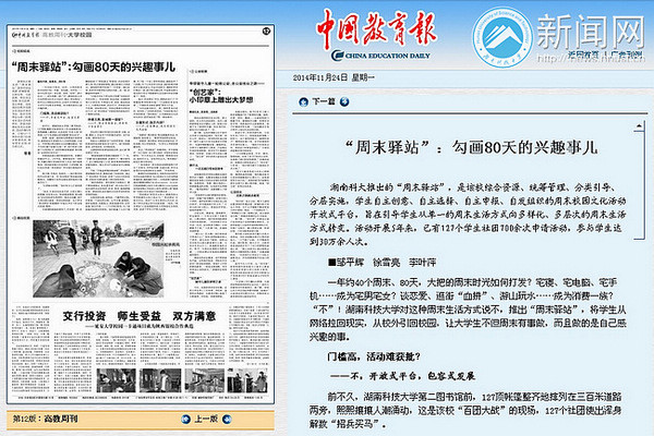 一年约40个周末、80天,大把的周末时光如何打发?宅寝、宅电脑、宅手机……成为宅男宅女?谈恋爱、逛街“血拼”、游山玩水……成为消费一族?11月24日,《中国教育报》在第12版以“‘周末驿站’:勾画80天的兴趣事儿”为题报道我校“周末驿站”转变我校大学生周末生活方式的情况。