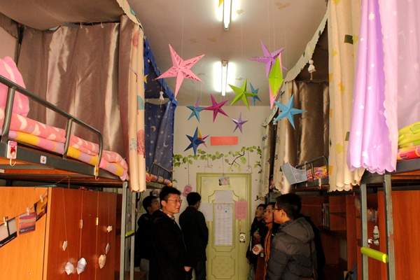 宿舍是学生活动的重要场所,通过宿舍文化节的雅室设计环节,新生们开始了对宿舍的装扮。12月12日12:30,学生工作处学生管理科科长姜太军、综合科科长汪丽丽、学生管理科老师吴大平、资助办老师周利斌分别对各学生宿舍区优秀设计寝室进行巡查。