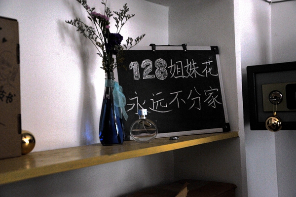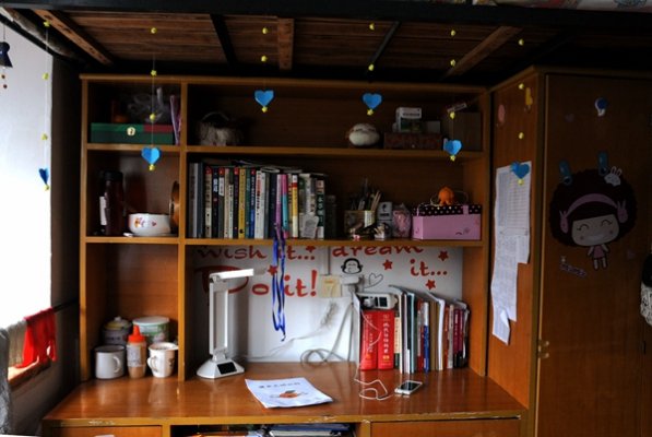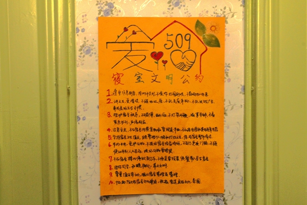 周利斌老师负责评定第七学生宿舍区女生寝室。在第七学生宿舍区二栋101寝室,开门后映入眼帘的是用爱心包围的寝室号与代表了四名寝室成员的门牌。这间寝室以“百度童年”为主题,她们用手工制成的风车和幸运草装饰墙壁,把旅行箱装饰成了一个个温馨的沙发。另外,她们还用卡纸做成元素周期表贴在了墙壁上,以此来提醒自己每天学习。