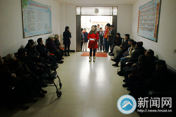 下午4点,志愿者为老人们带来精心准备的节目。一段热舞后,不太标准的太极表演逗乐了现场老人,谢国强、刘亚萍同学带来花鼓戏《刘海砍樵》切合老人“胃口”,赢得大声称赞。歌曲《精忠报国》带动现场氛围沸腾。全体志愿者合唱的《祝你平安》为老人送上衷心的祝福。为表感谢,一位老人还现场唱起了流行歌曲《荷塘月色》。表演收尾,志愿者们收获老人们的鼓掌致谢。