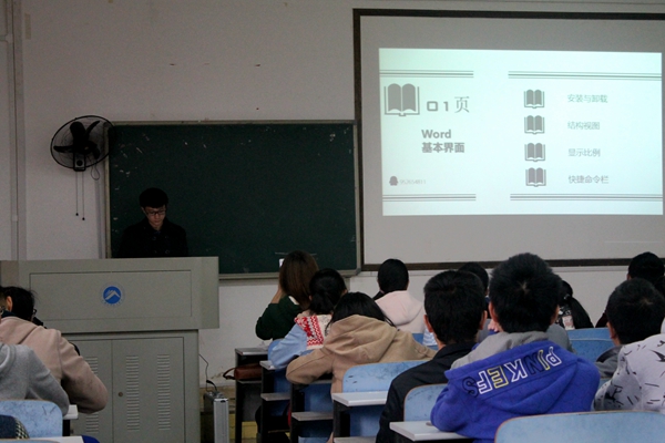 讲座开始,欧俊琦对在场的同学们说道:“计算机应用水平需要在长期的实践中提高,希望参加讲座的同学要有主动学习的习惯!”欧俊琦通过播放他制作的潇湘学院毕业晚会开场短片来引入他的主讲内容——office办公套件。