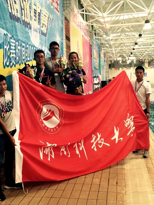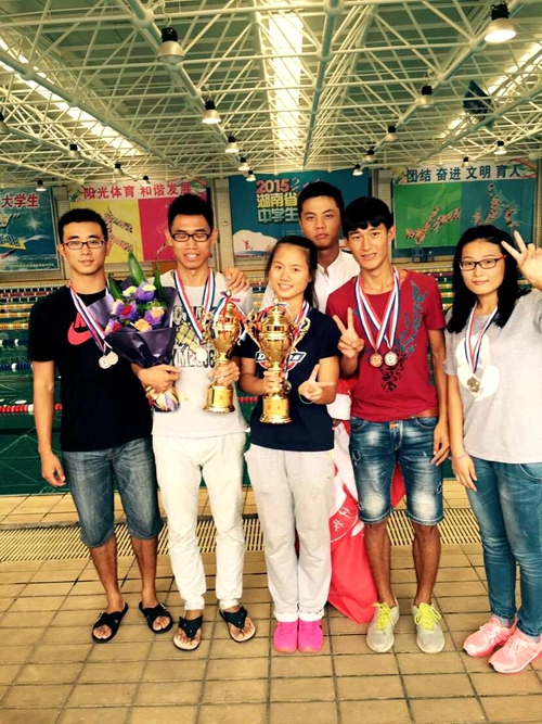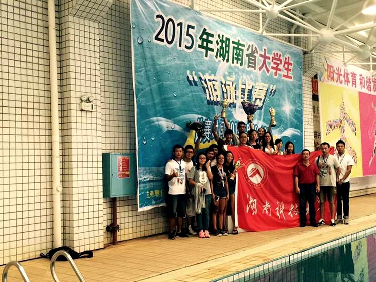 2015年湖南省大学生游泳比赛于9月7日一13日在长沙举行,我校游泳队勇夺45枚奖牌,以团体总分367分的成绩,荣居男子团体第二名、女子团体第二名和团体总分第二名。