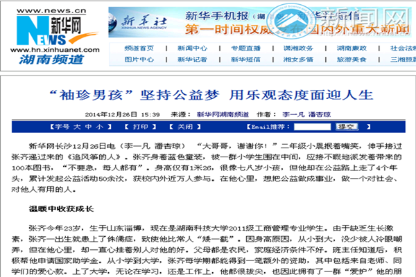 四年来,张奇行走公益路,累计发起公益活动50余次,使上百人受益。他说,要把公益当成自己的事业,成为播撒阳光的人。12月26日,新华网以《“袖珍男孩”坚持公益梦 用乐观态度面迎人生 》为题,对其感人事迹进行报道。12月31日,《湖南日报》在第4版“要闻”栏目再次刊文,聚焦大学生身边榜样,传递社会主义核心价值观。