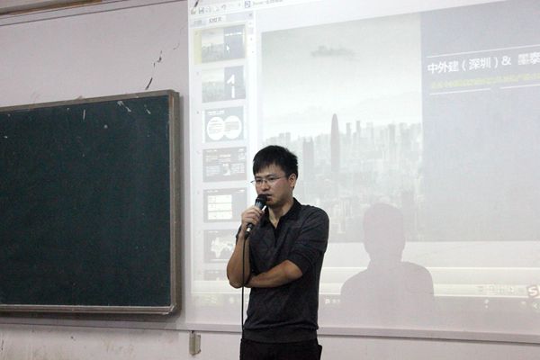 我校04级学生姚建伟,现为中外建工程设计与顾问有限公司深圳分公司副主任建筑师,他代表他所在公司来我校宣讲、招聘。此次宣讲会于第一教学楼108教室召开,学院主任伍国正和副主任郭俊明出席了此次宣讲会。