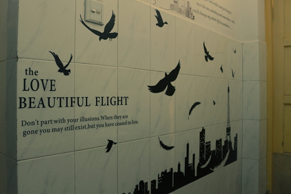 431寝室的门、墙壁和天花板上贴有冲出窗户的鸽子,自下而上冲向天空。寝室长王亮说,这代表着他们对梦想的追求和对自由的向往。男生们这样解释他们的设计主题:康桥象征寝室成员向往的高等学府;圣有圣洁之意,代表他们的目标神圣不可侵犯;啡代表咖啡,象征寝室的温馨与宁静,有闲适之意。