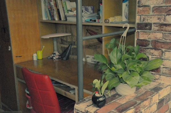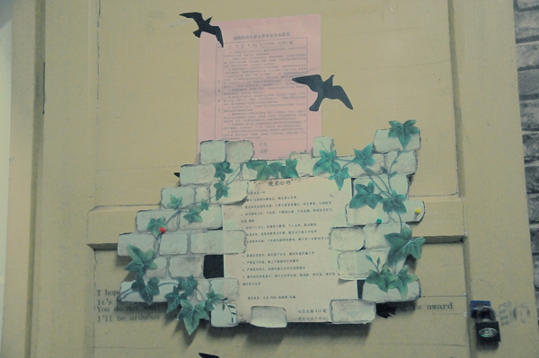 棕褐色的壁纸,让人仿佛进入中世纪的欧洲田园;环绕在床边与墙角的绿色藤蔓,让整间宿舍充满了小资情调;天花板上贴着的镜面装饰,温馨和谐。在建筑与城乡规划学院自然地理与资源环境2班的631寝室,一阵地中海田园风扑面而来。