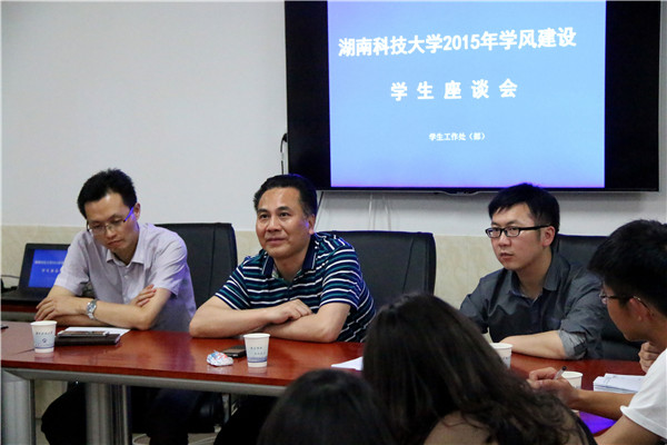 5月7日19:30,我校2015年学风建设学生座谈会在综合楼417会议室举行,学生工作处处长李红革、副处长蒋利平、学生管理科科长姜太军和老师吴大平出席了此次会议,学生自理会主席团成员及各学院代表参加座谈会?;嵋橛山礁贝Τぶ鞒帧?