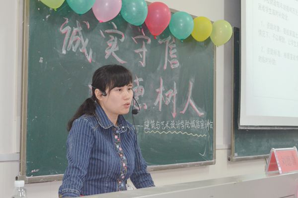 诚信两个字在生活中无处不在,而对于学生而言,诚信也体现在对学校助学政策的态度。刘德碧老师首先上台讲话。她将我校现有的助学政策一一列出,如国家奖学金、国家励志奖学金、国家助学贷款等一系列政策,并详细介绍了其助学金获取的基本要求。同时她也提醒同学们,在申请助学金的过程中大家必须做到“五个必须”和“六个不准”,以求真实公平。申请助学贷款是建立在同学们的诚信之上,缺乏诚信必然导致今后生活工作中的困难。刘德碧老师便列举反案例:毕业生欠助学贷款,住房贷款屡遭拒绝??杉?,一个人的诚信对他的一生有多重要,拥有良好的信用记录,不仅体现的是个人的素质教育,更能够方便今后的生活起居。