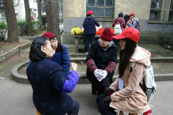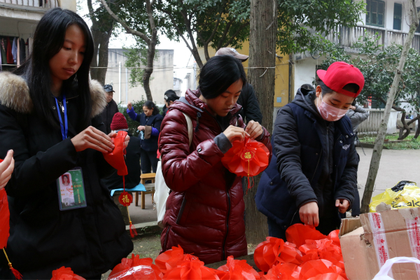 志愿者们刚走进了大门便受到了正在散步的老奶奶的热情迎接,笑容满面地招呼志愿者往里走。为给老人们营造一个温馨的新年氛围,志愿者们陆续走到中庭,挂起红色的大灯笼。在温暖的红色映衬下,老爷爷老奶奶围坐在庭院里和志愿者们一起聊天说笑,每个人的脸上都展露出了幸福的笑颜。