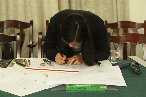 和普通的招聘会不一样,此次的招聘是以看快题成图的形式来代替以往普通的面试,需各位应聘学生自带画图工具。当日招聘现场,大型方桌上摆齐各种用具,学生们端坐于桌前等待考官下发考题。三位考官发完试题后,向应聘者提出画图要求,而后就为长达4个小时的检测时间。
