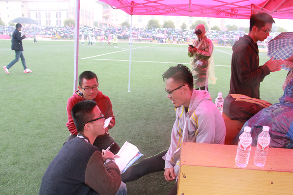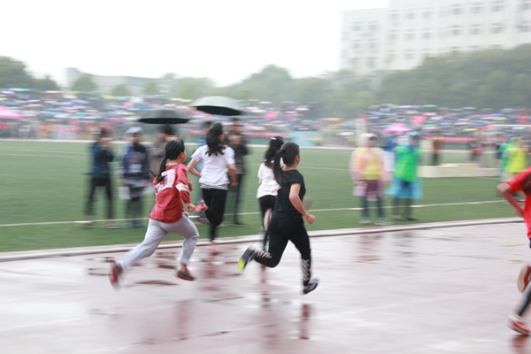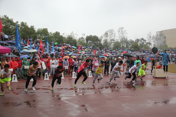 天空飘着小雨,风中带着些许寒意,但场上气氛一点都不冷清。运动健儿们顽强、奋力拼搏,为集体而战,为荣誉而战。观众席的掌声也不绝于耳,全场充满了激情的欢呼与热烈的呐喊。虽然100米赛跑只有短短10多秒,但气氛紧张,扣人心弦。随着一声发令枪响,运动员们像离弦之箭一样飞出起跑线,途中达到最大速度,最后全力冲刺。无论是第几名,迎接他们的都是欢呼与笑容,他们都是学院的骄傲。
