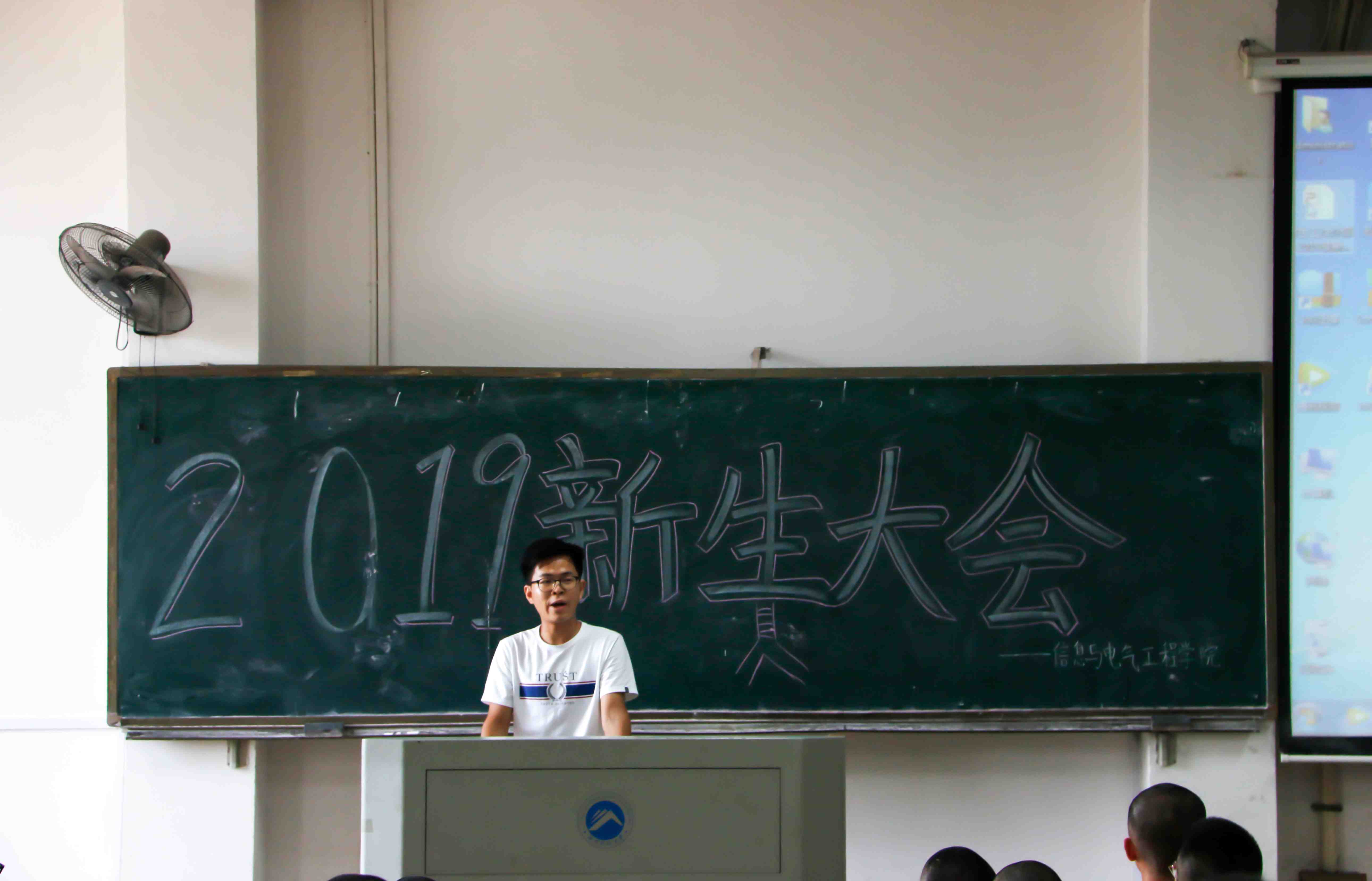 第五教学楼2-5教室的新生大会由卢明的PPT拉开帷幕,他着重介绍了学院的实验室,鼓励新生参加实验室,锻炼自己的学习能力,希望新生们能把精力更多地投入到动手实践当中,而不是挥霍自己的大学时光、过一个没有意义的大学。接着他又列举了学院获奖丰硕的各类科技比赛——恩智浦智能车大赛、节能减排大赛、全国大学生电子竞赛、电子制作大赛等赛事,他勉励新生要多向取得赛事奖项的学长学姐们学习,要有刻苦钻研、不言放弃的精神,为信息学院续写辉煌。最后他介绍了学院的各个专业,并对新生强调对于专业知识,要求新生一定要认真学习,为以后就业打下扎实的基础。