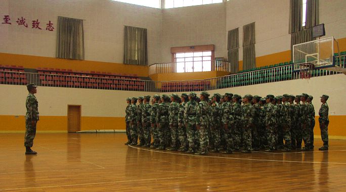 在前一学院会操完毕之后,人文学院方阵队在尹教的带领下,迈着整齐的步伐,庄严肃穆地走向体育馆正中央,开始队列会操评比。此次评比内容为:立正、稍息、跨立;停止间转法;蹲下、起立;敬礼、礼毕;齐步行进与立定;跑步行进与立定;正步行进与立定。方阵队全体成员认真聆听教官的指令,动作简洁有力,口号铿锵有力,各个流程都顺利完成。最后 比赛结束,学员们边喊着口号“雄鹰翱翔,我心飞扬;尖刀人文,勇创辉煌”,边有序离场。