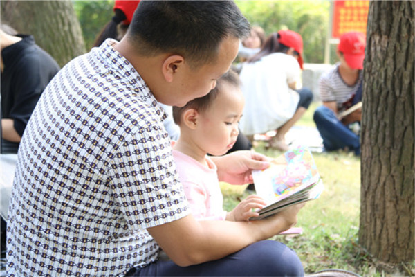 由于所摆点的图书主要以儿童图书为主,不一会儿便吸引了几个小朋友的目光。“妈妈你看!”其中一个小男孩指着图书上的小人,兴致勃勃地冲一旁妈妈道。说罢,母子俩便一同坐在地毯,小男孩专注地看起书来,母亲则静静为他摇扇。不多时,“读书林”书香渐浓,许多原本陪同孩子散步游玩的家长都纷纷带着孩子加入到了读书的行列当中。另一边,志愿者们亦是忙得不亦乐乎,他们一面向行人解释说明这个活动,一面把图书递到父母和孩子手里,还不时蹲下教小朋友认字识图。“这是什么呀?”一位年轻的父亲抱着年幼的小女儿指着一本书的扉页问道。“这是隔壁家的老奶奶!”小女孩童真的回答让父亲和一旁的志愿者都忍不住笑了起来。