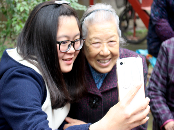 志愿者们围着老人们在椅子上坐下谈心,关切的询问老人们的身体和生活状况。在敬老院生活了4年的韩白兰老人,虽然已经88岁,但精神十分矍烁。她笑容可掬地说:“我在这里住得很好,每天早上都会出去散散步,还自创了一套健身操,经?;疃亟?。”同学们也向老人们介绍自己的学习情况,用幽默的语言逗得老人乐开了怀。