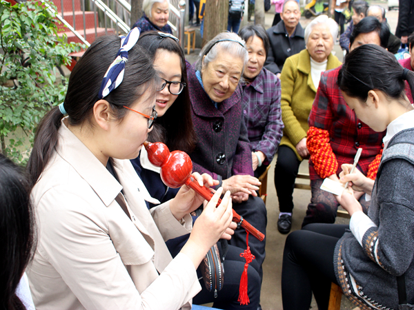 为了让老人们感受到更多的欢乐,同学们准备了各种活动。林悦航为老人们表演吹奏葫芦丝,老人们开心地和着节奏打着拍子、来自文学班的同学向老人们展示他们的书法作品、叶甜拿出手机和老人们自拍......随后,同学们还和来自湘钢二中的学生们一起为老人们表演节目。人文学院学生表演歌曲串烧,湘钢二中带来大合唱、小品《听戏》、拉丁舞和诗歌朗诵等。老人们也积极参与,登台合唱经典红歌。