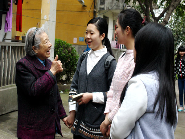 韩白兰老人对同学们说:“你们学校也常组织志愿者来看看我们,奶奶很开心?!彼臃坷锬贸黾阜荼ㄖ匠隼?,指着一张图片说:“报纸上的这个孩子是你们学校的学生,以前经常来这里来看我们。你们年轻人朝气蓬勃,我也希望你们天天向上!”