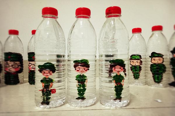 为增添军训乐趣,给18级新生们制造惊喜,17级的同学花了许多时间和精力,用丙烯颜料,在发给新生的每一个水瓶上,精心绘制了身着迷彩服的漫画小人,姿态各异,或正步、或深蹲、或军姿,被阳光晒红的小脸,蹲太久而发抖的双腿,训练太苦泪水盈眶的眼角,都表现的生动形象,妙趣横生。