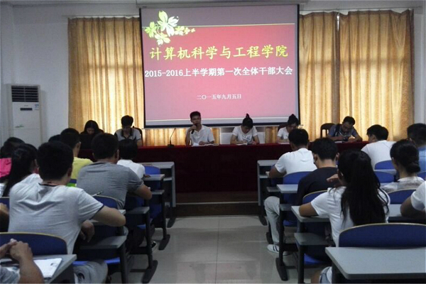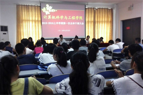 9月5日下午4点,计算机学院于逸夫楼108室召开2015-2016学年上学期第一次全体学生干部大会。院学工办主任吴成义,辅导员老师易靓靓、曹睿卓、肖闯出席,院团委学生会全体学生干部及各年级班长、团支书参加了本次会议。