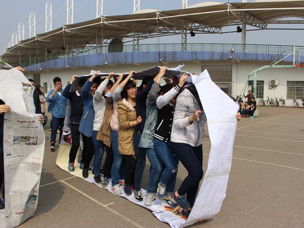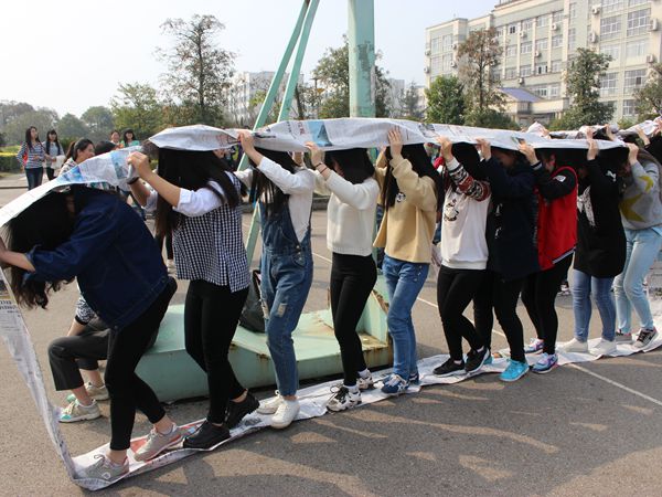 另一个项目“无敌风火轮”则利用废旧书物做成一个可以容纳10人的大圆圈,众人齐力推动圆圈前行,中途不可断掉,先到达终点即为胜利。各个小组都在赛前进行了积极认真的筹备,寻找废旧书物并用胶带贴牢,“缝缝补补”踏上了比赛之路。随着一声令下比赛开始,同学们一个个“晕头转向”赛况极其“惨烈”,“风火轮”有踩烂了的,有转错了方向的,大家笑着闹着乱作一团,赛场上洋溢着青春的气息。最终在友谊第一,比赛第二的宗旨下,所有的队伍都在笑声中一步一步的“挪向”了终点。最终,历史二班,文学三班和语言一班夺得前三甲。