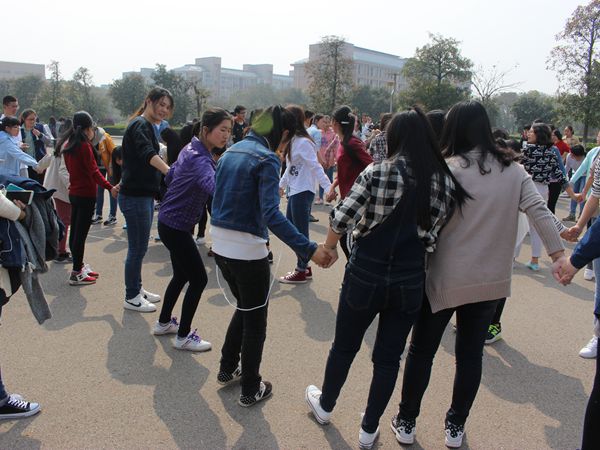 “火线传递”要求15个人手拉手在保证不用手且绳子不落地的情况下将绳子从头至尾穿过,用时最短即为获胜。“绳套穿过来的时候,下一位同学也要灵活一些啊,大家要互相帮助嘛。”刚开始训练时,同学们还很拘束,对着软绵绵的绳套只能干着急。经过短暂的磨合,大家越发默契,开始的难为情也融化为了欢快的笑容。