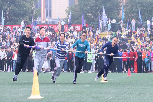 随后进行的是在赛场内交替往返跑的“同心追梦”。发令枪一响,教职工们手持同一根横杆,相互配合,身随声动。赛程中,排在内部的教职工用力挥杆并保持小跑姿态,后部的教职工则负责“甩尾”,加快步伐向终点冲刺,看似简单的动作,却体现出了教职工们团结的力量。
