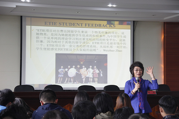 会议伊始,周栋向同学们对周谦教授进行了详细的介绍,并代表学院全体师生对周谦教授的到来表示热烈欢迎。首先,周谦教授向同学们说明了ETIE项目内容及选拔条件。项目包含:3+1本硕连读项目、4+0.5+1的研究生项目等,各项目对学生的要求不一,能够给予学生更多机会。紧接着,她展示出的ETIE outcomes、why ETIE、ETIE student feedbacks三个模块更加深入全面地带领了同学们了解项目内容及学?;肪?。在接下来的互动交流环节,周谦教授对在座学生提出的问题一一耐心解答。随后,刘文娟具体讲解了报名要求及注意事项,鼓励同学积极参加。最后,周栋致结束语,本次ETIE学生交流项目事宜宣讲会圆满结束。