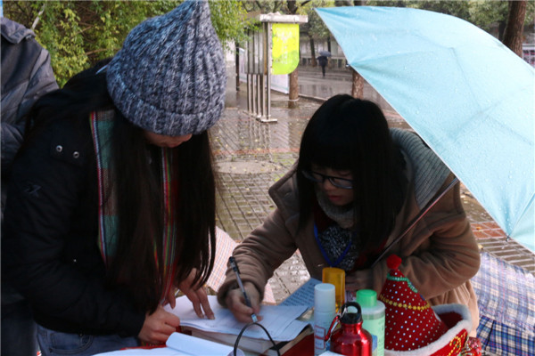 十二月的天气里,寒风,冷雨。“雨下得很大,我们几个人搬着东西从三教跑过来。没有打伞,却都要先护着物资。桌子很沉,一路搬来,只能在屋檐下避雨?!敝驹刚呙且恢奔崾卦诎诘阏蟮?,望着未曾停过的雨,都纷纷搓着冻红的手。