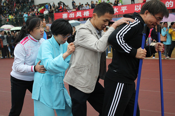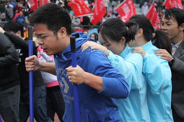 随后,类似于同足赛跑的协力竞走比赛也开始了,老师们纷纷尝试后发现,只有同队4个人协调一致才能带动踏板前进。只见商学院丁文彬老师握住安全把手打出头阵,同另外3名老师自信地立于起跑线前。随着一声枪响,他们一边喊着“左——右——左”嘹亮的口号,一边覆在前方队员的肩部,稳稳地向前迈进,到达一端之后由另一队老师成功接力。赛道上,老师们共同出力,共同行进,成功抵达终点后大笑着互相拥抱,为各自加油鼓气,眉眼之间尽显喜悦与满足,即使是乌云密布的阴雨天气也无法挡住他们由内而外发出的魅力。