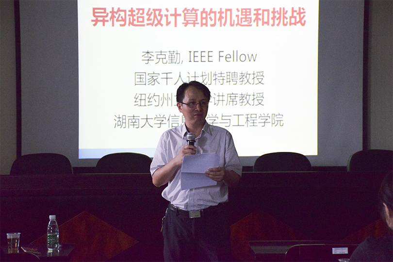 6月25日下午3点整,纽约州立大学讲席教授、湖南大学信息科学与工程学院国家“千人计划”特聘教授李克勤应我院邀请在逸夫楼201会议室作了题为“异构超级计算的机遇和挑战”的精彩学术报告。计算机科学与工程学院教师和部分本科生参与此次报告会,会议由院长刘建勋主持。