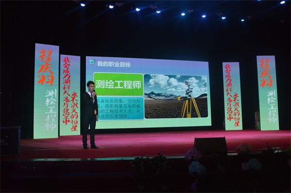 16级测绘工程专业的翟庆宇同学代表资源环境与安全工程学院参与了此次决赛。作为第三个出场的选手,翟庆宇同学以自身专业为立足点,侃侃而谈。“测神州大地,绘美好蓝图”翟庆宇同学从认识自我、就业环境、职业规划、实施战略、评估调整五个方面具体阐述了他的梦想实现之路,“我会成为湖科大这片夜空中永不泯灭的恒星。”其从容自信,富有激情而又不失条理的演讲赢得掌声阵阵,尽显资安风采。