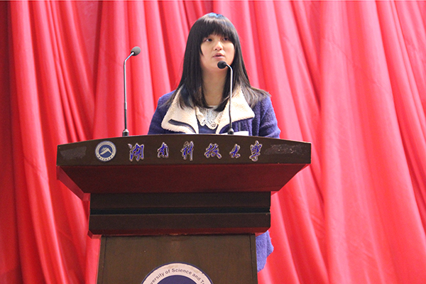 校十佳大学生、2012级计算机科学与技术专业的郭白露作为优秀学生代表进行了典型发言。她讲述了自己近三年的大学生活与感悟,并分享了“目标+坚持+尽善尽美=更上一层楼”的等式学习技巧。她与在座同学共勉:利用大学时光,努力提高自身综合竞争力。