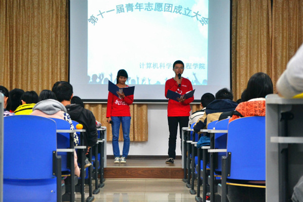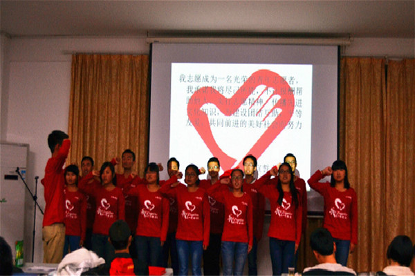 伴随着一段优美的旋律,大会在刘文婷,王莹等人的开场舞中拉开帷幕。随后由第10届校志愿团团长颜若儒以及现任委员闫贺代表讲话,为志愿团献上祝福。之后,由廖琪带领志愿团全体成员宣誓:“我志愿成为一名光荣的青年志愿者......”激昂的情绪,感染了现场的每位成员。紧接着的是志愿团为大家精心准备的节目。大会最后,颜若儒授旗予第11届志愿团团长毛健芳。毛健芳表示会以团队利益为重,积极配合学院工作,同时加强与其他学院的交流。