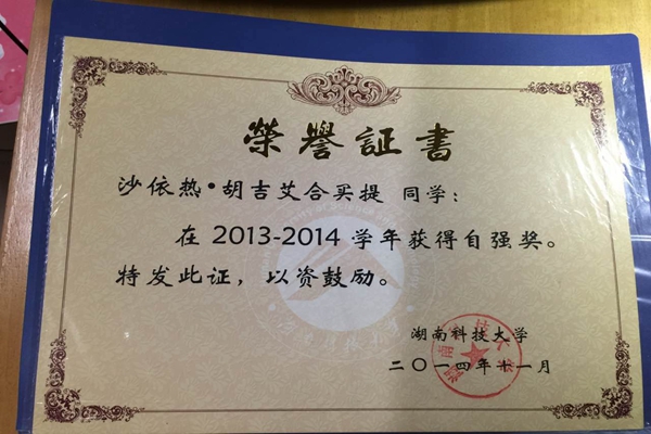 刚上大学时,因受教育水平的差异让沙依热学起英语来十分吃力,但“不想看到父亲失望的眼神”这一信念支撑她比别人更加刻苦地学习英语,最终她顺利地通过了英语四级。沙依热同学自己努力学习的同时还不忘督促厌学的同乡同学学习,坚持不懈地提醒他做作业,催促他上课,这一坚持就是四年。