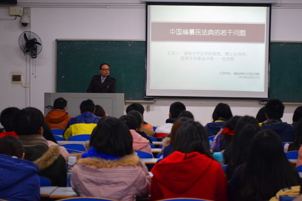2014年,在中国共产党第十八届四中全会上,《中共中央关于全面推进依法治国若干重大问题的决定》提出:加强市场法律制度建设,编纂民法典。这意味着我国将开启一个公民权利?;さ男率贝N勾蠹叶灾醒胝庖恢匾俅胗懈羁痰娜现土私猓ㄑг河行已氲胶洗笱Хㄑг航淌凇⒉┦可际Α⒑鲜》ㄑЩ岣被岢?、中国法学会理事屈茂辉于 12月 11日 晚7时30分在九教405为法学专业学生做讲座。到场嘉宾有副院长喻军、胡正昌,法学系主任刘敏、邱帅萍,法学系老师李云霖、夏飞明,朱红梅。