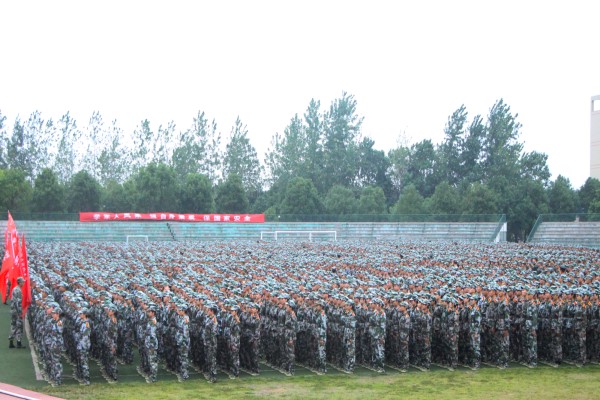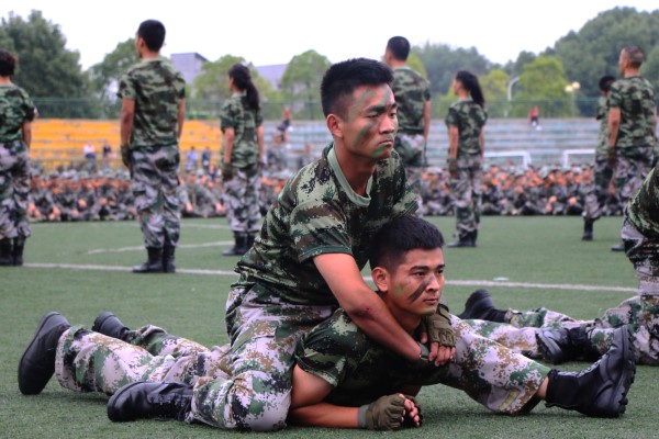 “继承人民军队光荣传统和优良作风,为中华民族复兴刻苦学习”。七千余名“学生兵”,身着迷彩绿军装笔直整齐的在绿草地红跑道上迎接五星红旗,他们精神抖擞,学军人风采,强自身素质。校长李伯超说:“我们当军人的,要军纪如铁,意气如钢,不当逃兵”。同时他也预祝今年军训能高质量完成并取得成功。教官代表潘国禹,新生代表陈可寒分别发言。他们各自表达了自己的信心,承诺共同完成大学生军训。接着,大学生军训团教官会操表演与军事演习。他们笔直整齐的摆出“八一”字样,展示着人民解放军队应有的一面?;岵俦硌莺笫蔷卵菹?,40多名教官把各个搏击,自卫动作演示得淋漓尽至。展示了人民军队、教官应有的精神面貌。最后,胡石其副校长宣布2017级军训正式开始。