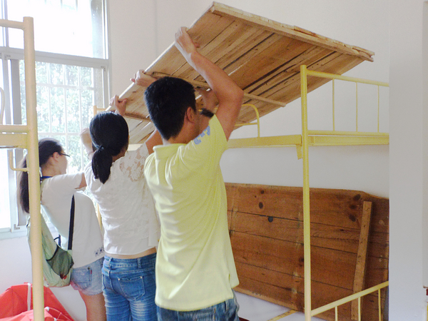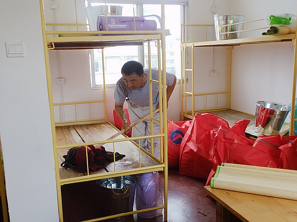 相比女生的顾虑,男生这边则宽心许多。来自江西的钟荣兴正埋头用力的擦洗地板,见到记者走进来连忙不好意思地起身让座。“搞卫生真的很辛苦,但是一想到这里是我们四年的家辛苦一些也值了?!彼蛋照飧龈叽蟮哪泻⒂秩险娴卮蛏ㄆ鹄?。15届汉语言一班的罗霄一见面就与志愿者热情的攀谈,他笑眯眯地说他的父亲也是从科大毕业,因此来到这里并没有陌生的感觉,反而像是回家一样。七区4栋425寝室的几个男生则聚在一起畅谈起对大学的规划,“我希望能进入学生会或是班委会,我觉得那会对提升自己有很大的帮助?!崩醋院幽系耐躅坪菩判穆厮怠?br>