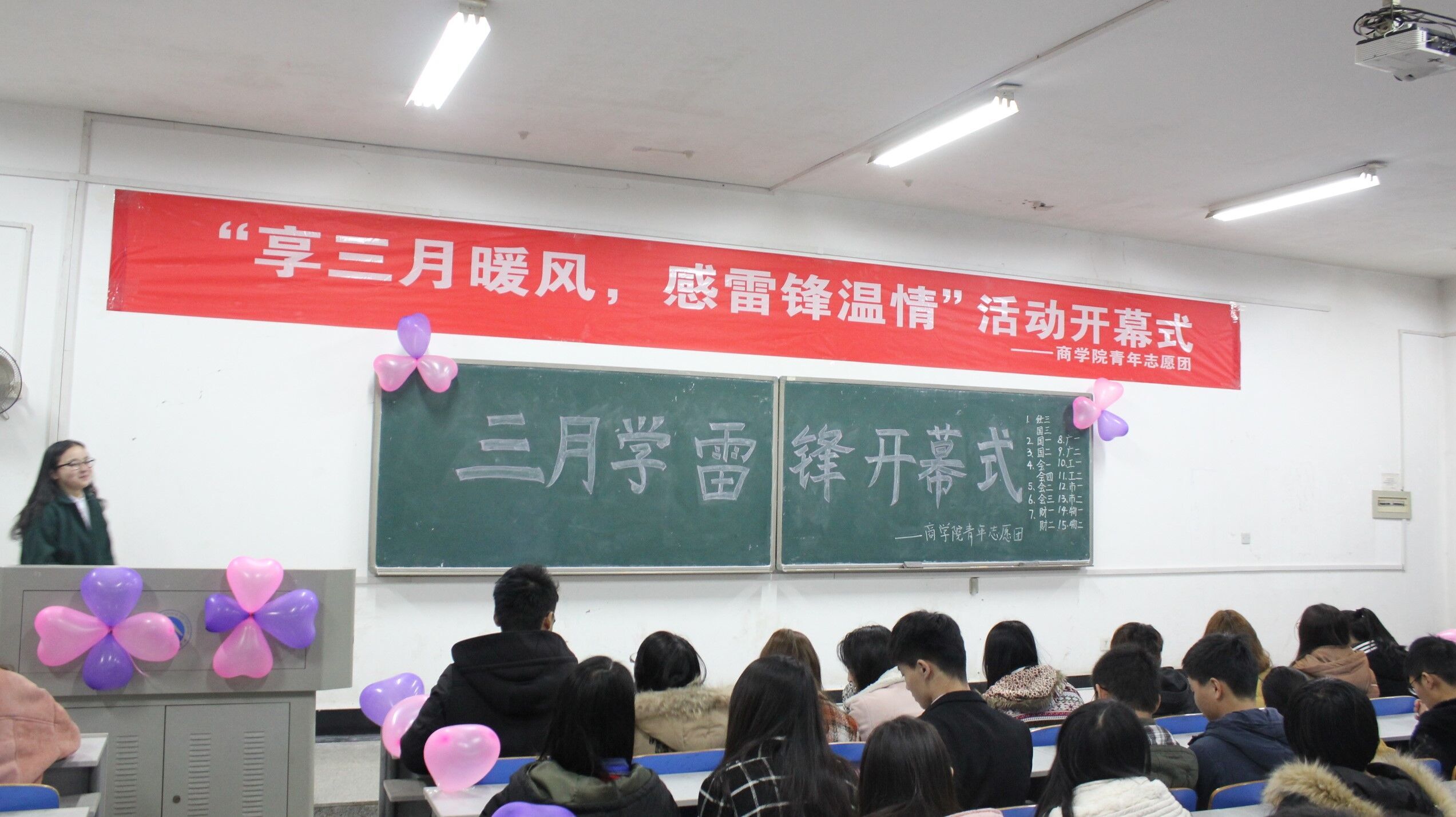 3月13日18:00,商学院以“享三月暖风,感雷锋温情”为主题的学雷锋活动开幕式于一教102开展,商学院青年志愿团成员及众多志愿者参与了此次活动。