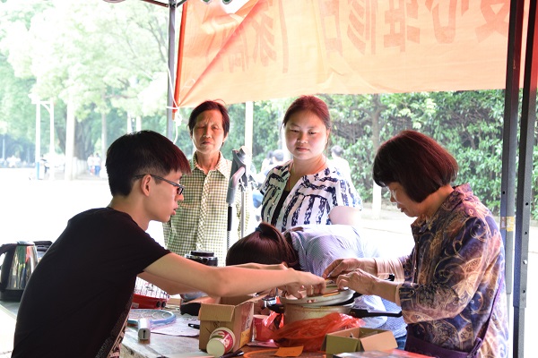 清晨,伴着缕缕凉风,所有维修及服务人员兵分两路,前往维修地点,进行准备工作。上午9:00,维修活动正式开始,物电学院的义务维修人员精神抖擞,以良好的风貌迎接师生和居民的到来。每一次拆分与组装,每一次焊接与检测,维修人员都聚精会神,一心一意,尽百分之百的努力为有困难的师生和群众解决各种积扰问题。在学生宿舍八区维修点,一名维修人员半蹲着,目不转睛地进行焊接,鼻尖上渗出了密密的汗珠;在北校工商银行维修点,一名维修人员拿着损坏的电器,耐心地向一位老奶奶讲解着,展现着物电学子的热心和至诚。临近中午,天气变得愈发闷热,但是丝毫没有影响物电学院的维修人员,有的甚至牺牲午饭时间为群众答疑解难。院党委副书记杜鑫和团委书记杨廷良老师也莅临修理现场慰问维修人员,鼓励大家撸起袖子加油干,积极为义务活动做贡献。汗水浇筑的是精神,辛劳献出的是真情,下午5:00,义务维修活动临近尾声,依然有不少师生和居民携电器陆陆续续地前来维修和咨询,我们的维修人员仍热心地处理他们的问题。迎着朝阳,踏着晚霞,一天的劳累换来的是群众的笑容和内心的满足。在采访一位维修人员时,他发自内心地说道:“义务维修活动给了我们一个平台,一个实践自己,充实自己,服务于民的平台,这是义务,也是作为物电人、科大人的责任?!毙矶嘣诔【用窈脱捕哉獯位疃衷奚?,希望这样的活动能够持续下去,下午5:30,“爱心维修日”活动顺利结束,大家清理好现场,载着满满的收获而回。