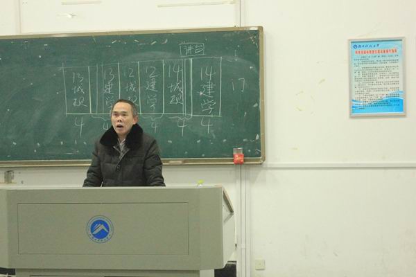 “试想十几年后,繁华都市为你所构建。假想几十年后,宏伟建筑为你所打造。我们以此为豪,世界以我们为豪?!痹谥鞒秩思ぱ锏拇试逯?,12、13、14级建筑学与城乡规划专业介绍大会于 12 月 16 日 晚 19:00 在第一教学楼 204 室拉开序幕。出席本次大会的嘉宾有院长吴越、院党委书记康光宗、学工办主任刘云峰老师、各专业老师陈新华、吴越老师等及 12 、 13 、 14 级辅导员老师。