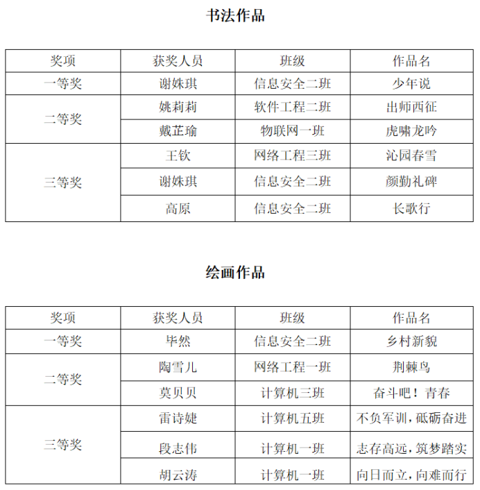 终的评选结果是由评委评分综合摆点活动中同学们的投票数,按照6:4的比例得出获奖名单,其中书法、绘画作品各评出一等奖1名、二等奖2名、三等奖3名、人气奖1名。(附获奖名单)