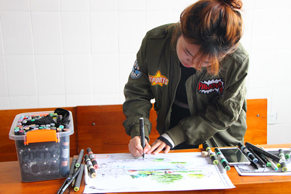 本次比赛的参赛选手众多,竞争气氛也是异常火热。比赛方式主要是选手自由发挥,赛制时间为线稿和色彩组两个小时,快题组四个小时。在比赛过程中,赛场上如同一场没有硝烟的战争,每个选手都拿出自己的看家本领大显身手。站立绘图、坐着绘图或是直接趴在课桌上进行绘图的各种场景随处可见。选手们都选择以自己最舒适的方式来进行手绘,力求完美。比赛中,来自湖南城建职业技术学院参加色彩组的李朦朦选手清新脱俗的上色方式吸引了监考人员的注目,就连同为参赛选手都不住赞叹。参加快题组的选手经历了四个小时的绘制,在限制时间内完成了自己的快题设计。赛后,很多选手都表示第一次接触这种题型,虽然陌生,但极具挑战性。结束比赛的廖玲选手在接受采访时这样说到“在比赛过程中,我选择了中规中矩的设计思路。有限的时间内,既要质量又要速度,对我来说都是很大的挑战。大家都很厉害,难免有点紧张,导致自己忽略了很多细节。但是在最后的时间内完成了作品,也感到很高兴!”